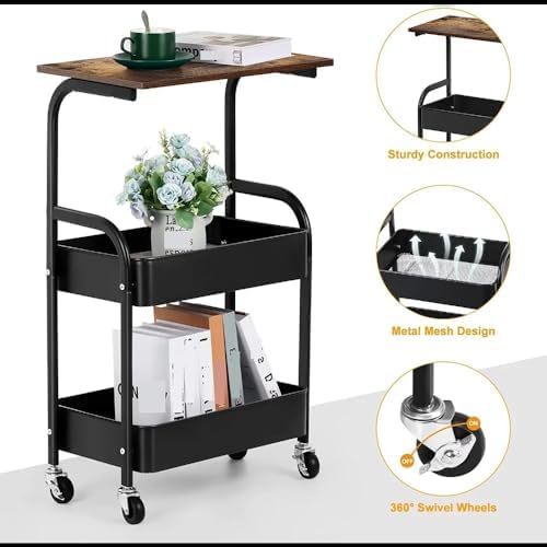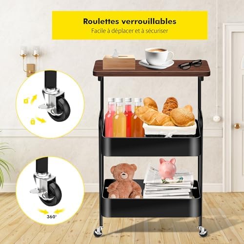 Chariot de rangement roulant 3 niveaux avec plateau en bois